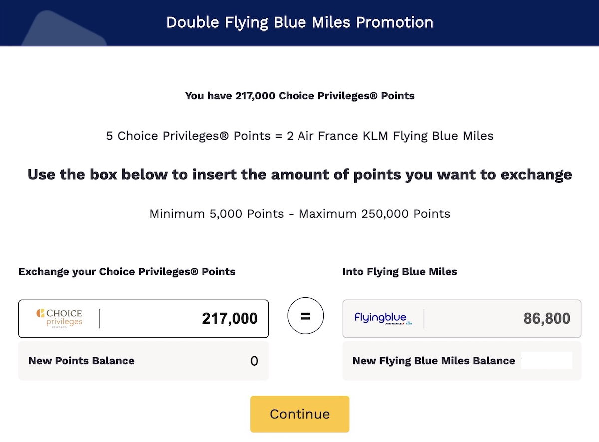 Meanwhile I constantly use Air France-KLM Flying Blue miles, so with a 100% bonus, I figured this was as good of an opportunity as any. Given the 5:2 transfer ratio, I could convert 217,000 Choice Privileges points into 86,800 Air France-KLM Flying Blue miles.