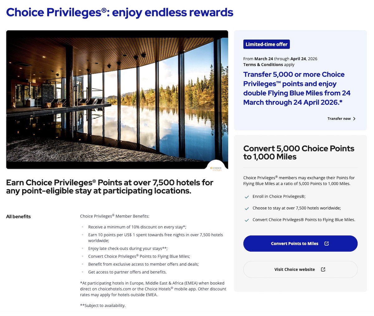 Choice Privileges lets members convert hotel points into airline points, and typically these transfers are at a 5:1 ratio. However, between March 24 and April 24, 2026, you can receive a 100% bonus when you move Choice Privileges points to Air France-KLM Flying Blue. So that means you get 2,000 Flying Blue miles for every 5,000 Choice points, or put another way, each Choice Privileges point gets you 0.4 Flying Blue miles.