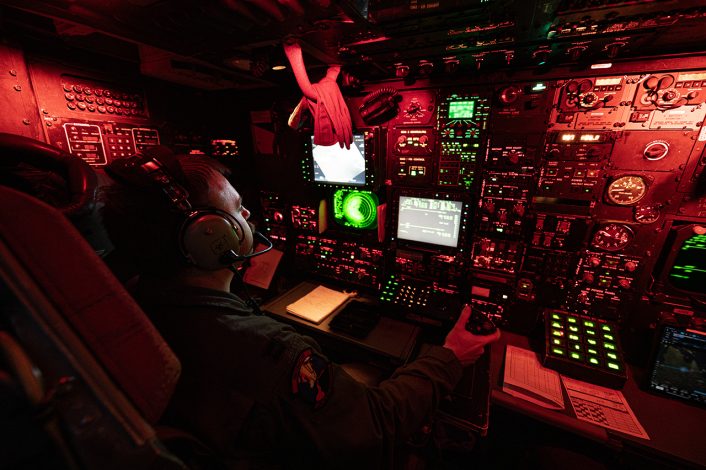 U.S. Air Force Capt. Steven Lawless, 23rd Expeditionary Bomb Squadron radar navigator, monitors navigation equipment in a B-52 Stratofortress aircraft during a Bomber Task Force mission over the North Atlantic Ocean, May 27, 2025. (U.S. Air Force photo by Staff Sgt. Bryan Guthrie)