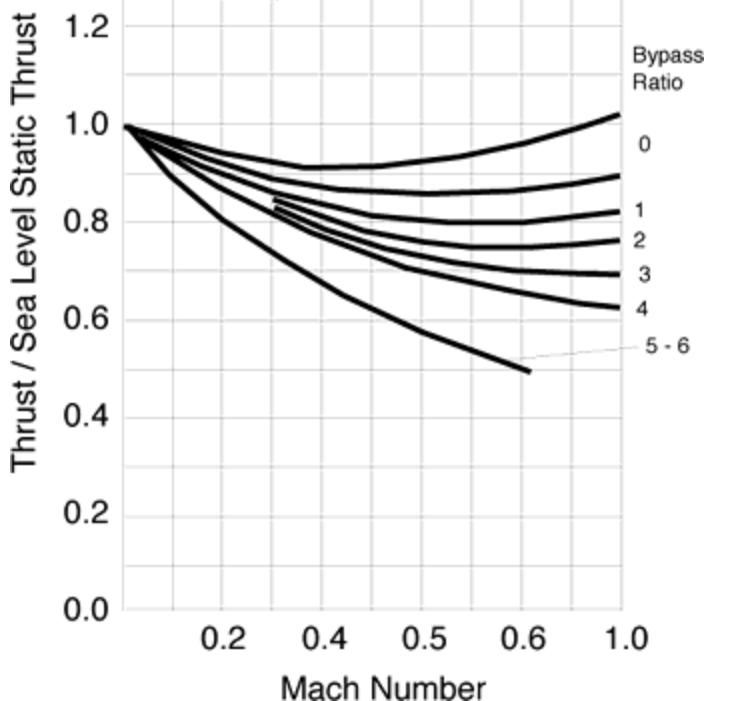 The development of turbofans for our airliners has gone from BPRs of around 5 in the 1990s to around 10 for the present generation introduced from 2010 to a projected 15 for the next generation. This increases the thrust lapse as speed increases.