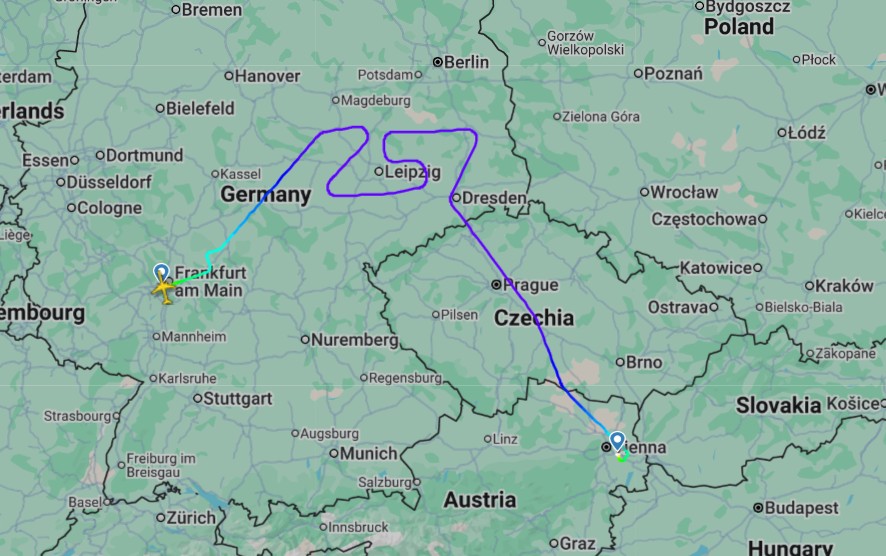 The commemorations began at 10:27 local time as the aircraft, known as ‘Red Passion’ because of its bright red livery, pushed back off its stand at Frankfurt-Main Airport (FRA) for the flight to Vienna with the specially allocated flight number DE757. The aircraft arrived in Vienna at 11:34, an hour and seven minutes after taking off from Frankfurt.