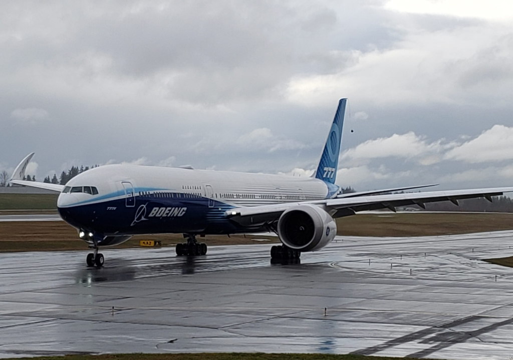 The first Boeing 777-9 taxis out for its first flight of the program. Credit: Leeham News.