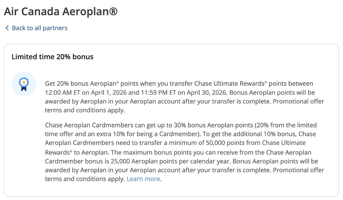 Between April 1 and April 30, 2026, you can earn a 20% bonus when you transfer points from Chase Ultimate Rewards to Air Canada Aeroplan.