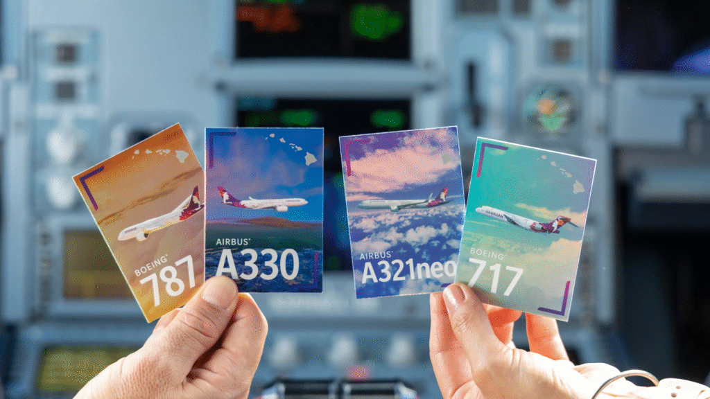 Hawaiian Airlines has unveiled a range of exclusive trading cards and digital cards as its newest must-have in-flight collectible. As of today, passengers can ask a pilot to receive one of four trading cards — each featuring a different type of Hawaiian aircraft — and collect up to 66 digital cards for each Hawaiian plane in the fleet.