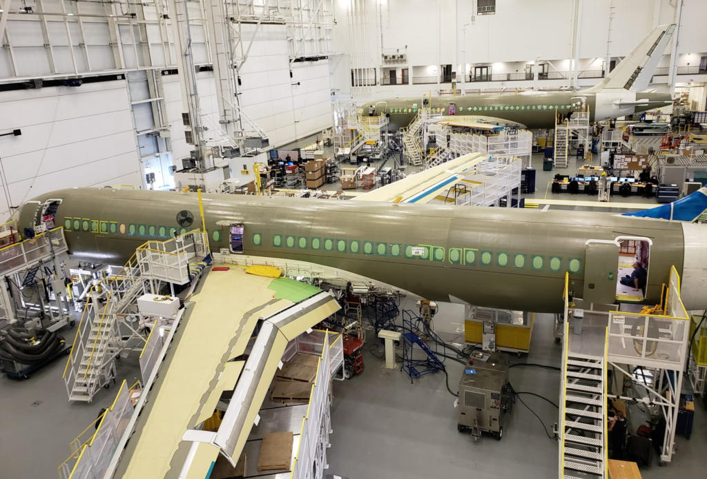 Airbus A220 production line in Montreal, when it was still Bombardier. Airbus is revamping the process to become more efficient and reduce costs. Credit: Leeham News.
