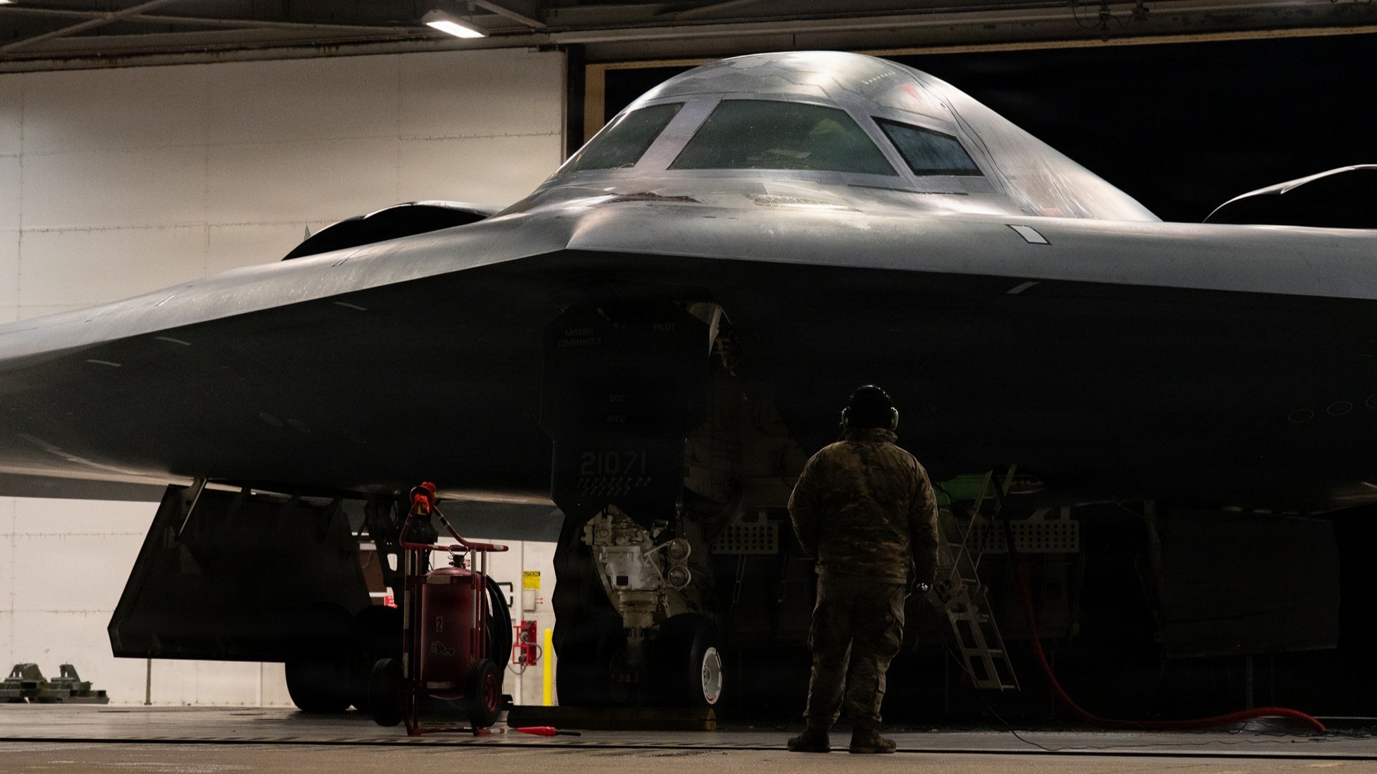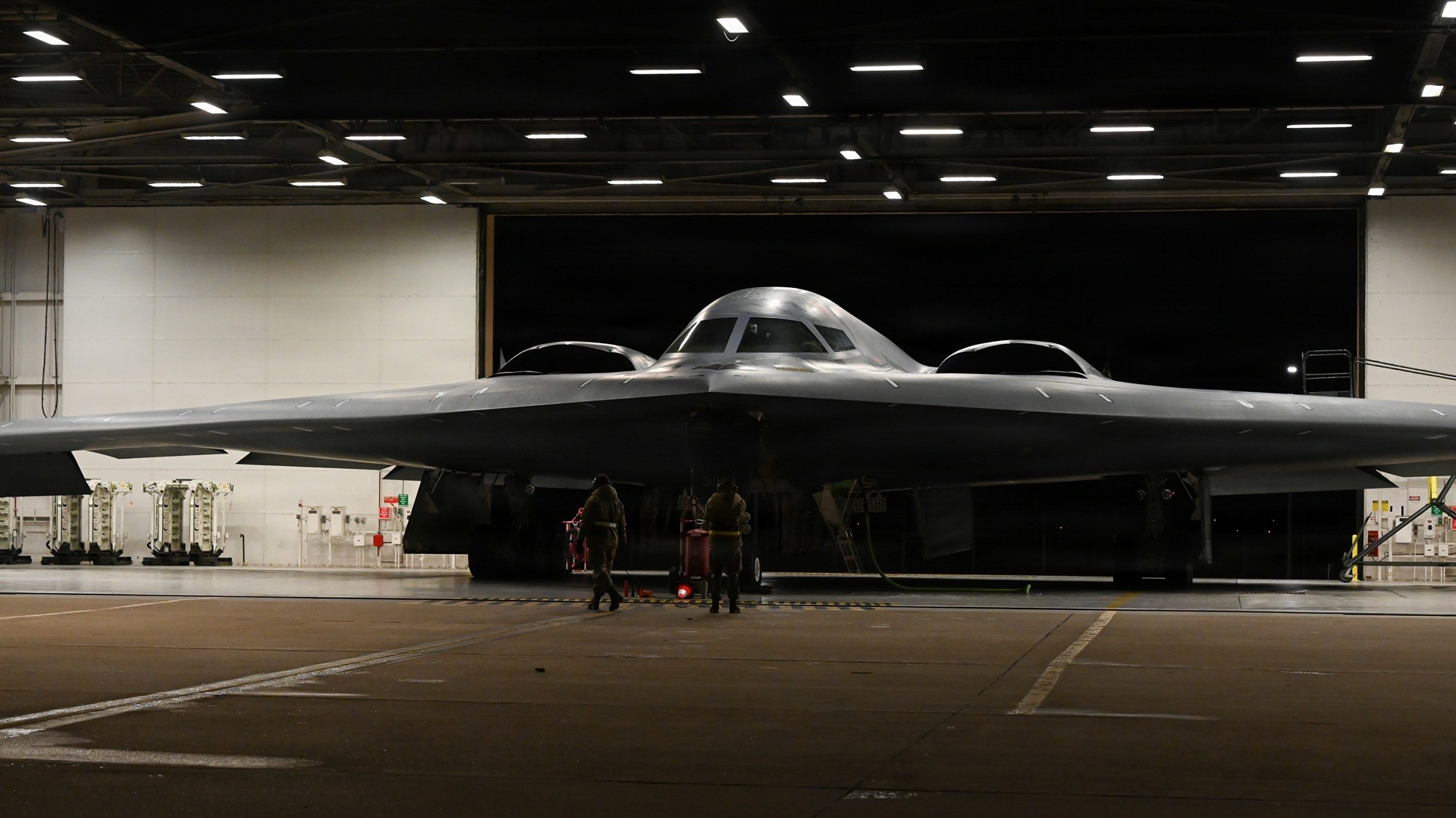U.S. Air Force crew chiefs perform pre-flight checks on a B-2 Spirit stealth bomber during Operation Epic Fury, March 17, 2026. (U.S. Air Force photo)