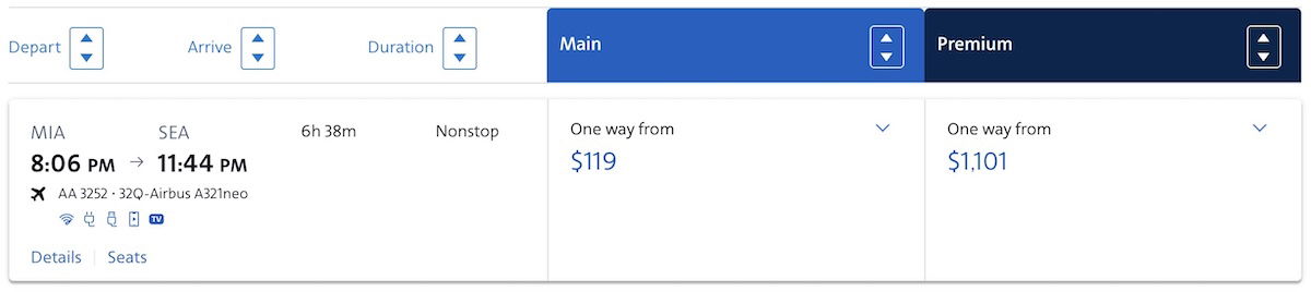 Since all of the above examples are situations where I would pay for first class, let me also give an example of where I wouldn’t. Let’s take a Miami to Seattle flight, where (non-basic) economy costs $169, and first class costs $1,101.