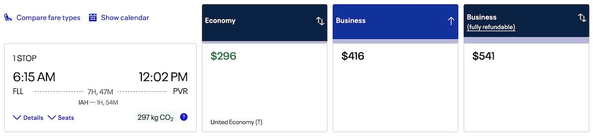 For a last example, let’s take a look at a Fort Lauderdale to Houston to Puerto Vallarta itinerary on United, where (non-basic) economy costs $296, and first class (or business class, as it’s marketed here) costs $416.
