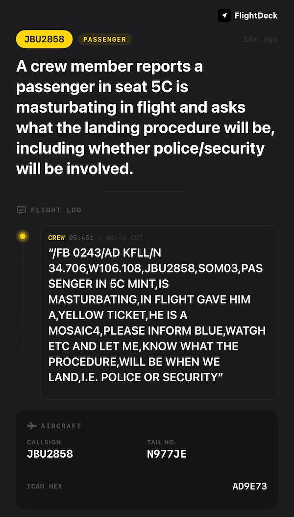 JetBlue Crew: “PASSENGER IN 5C MINT IS MASTURBATING… HE IS A MOSAIC4”