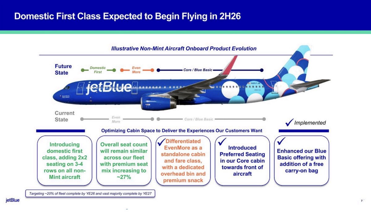 JetBlue will be introducing a new premium cabin on all planes that don’t currently have Mint. This may be branded as “Mini Mint,” or as something else. JetBlue has confirmed that it will introduce this product on a widespread basis in the second half of 2026. Around 20% of the non-Mint fleet should have this product by the end of 2026, and a vast majority of planes should have the product by the end of 2027.