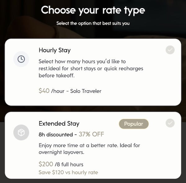 The rate is $40 per hour, and the sleep pods need to be booked for a minimum of four hours. If you stay for eight hours, you receive a discounted rate of $200, meaning you’re only paying for five hours, a 37% discount off the rack rate.