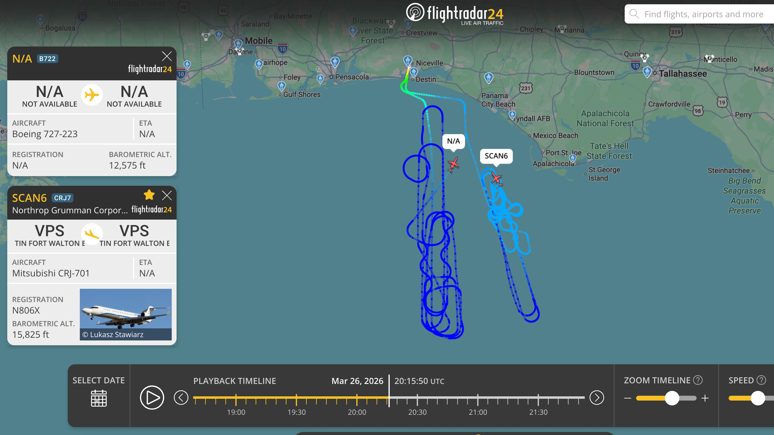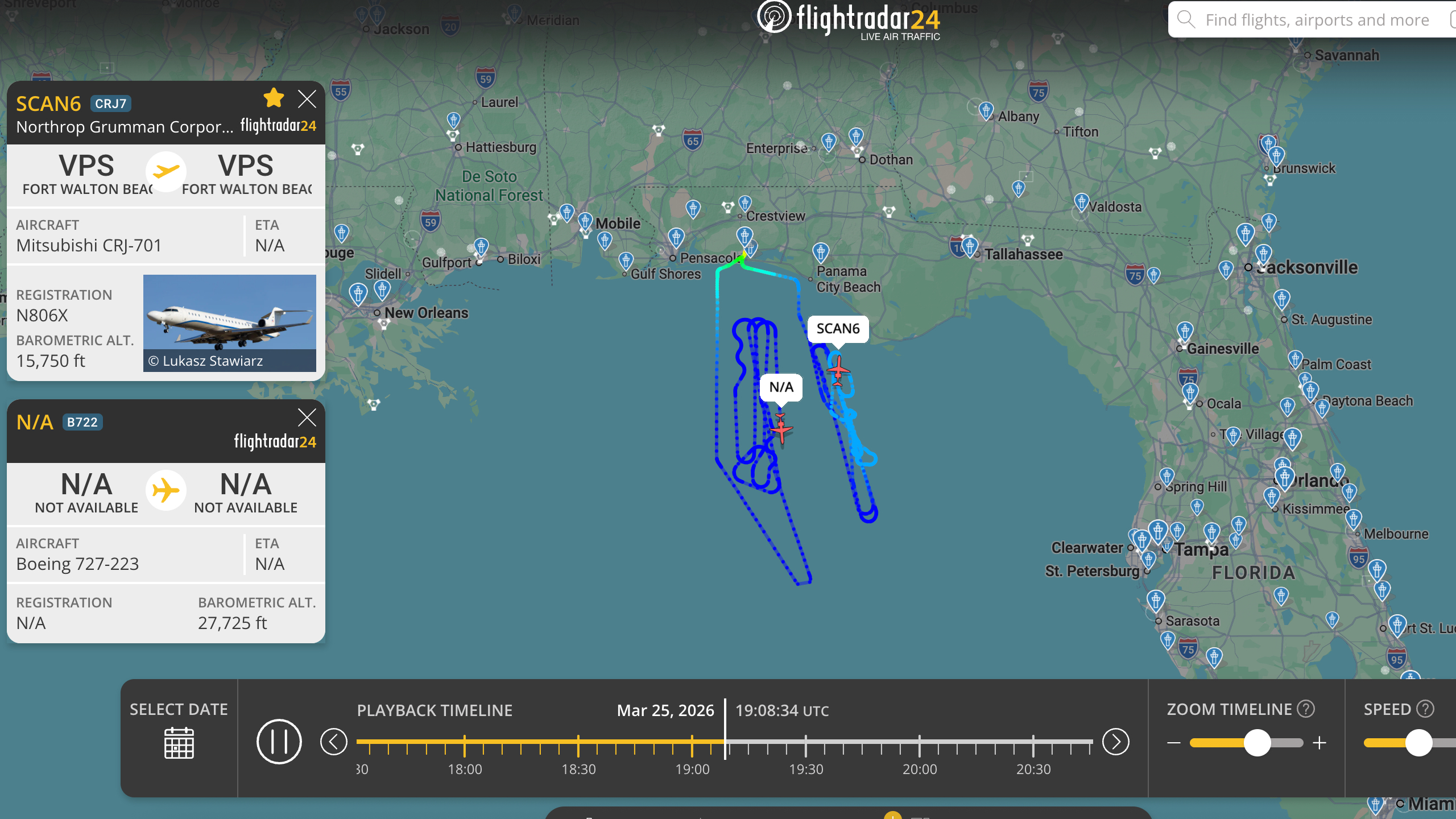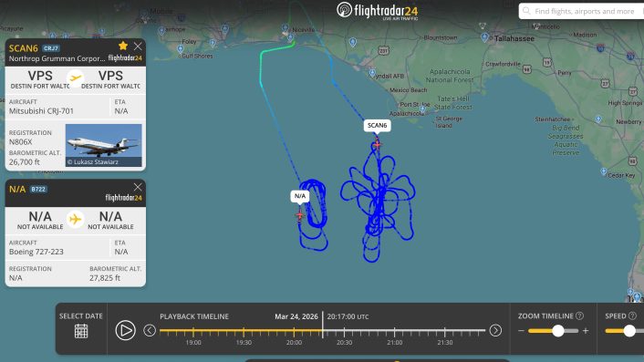 For three consecutive days, on Mar. 24, 25 and 26, two testbed aircraft, the Northrop Grumman CRJ-700 carrying the U.S. registration code N806X and typically operating using the radio callsign “SCAN 06”, and the Raytheon’s Boeing 727, with registration N289MT and radio callsign “VOODOO 1,” carried out concurrent missions over the Gulf of Mexico (Gulf of America).