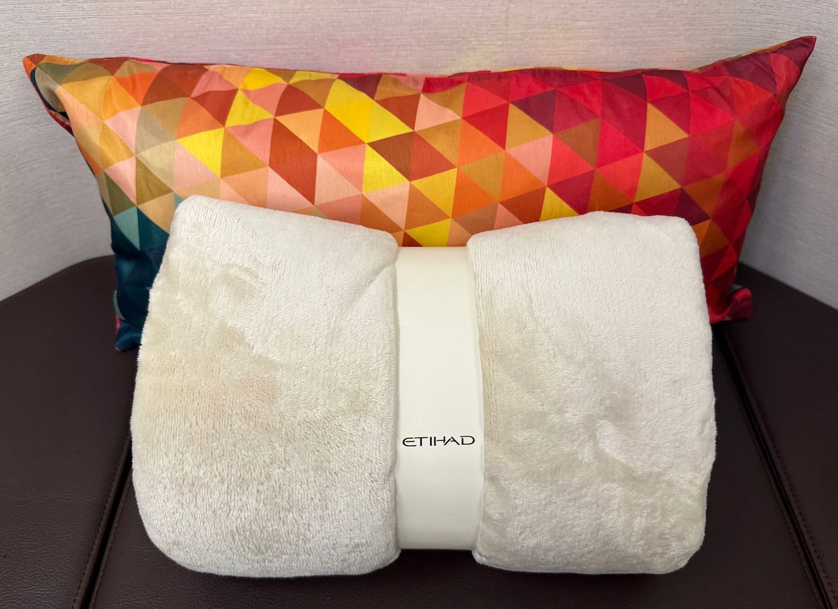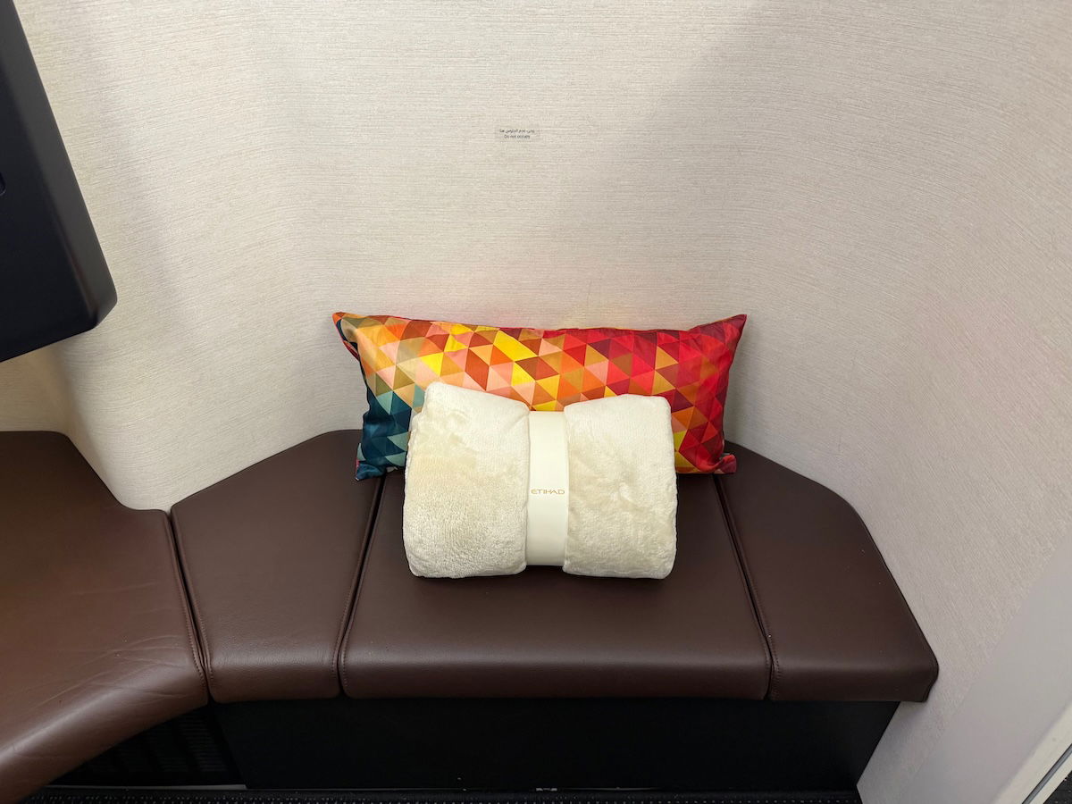 Despite the unusual look of Etihad’s A321LR first class cabin, there was no shortage of amenities. Already waiting at my seat upon boarding were the typical Etihad first class pillow and blanket. There’s additional bedding when it’s time to sleep, but that’s just intended for getting comfortable while lounging around.