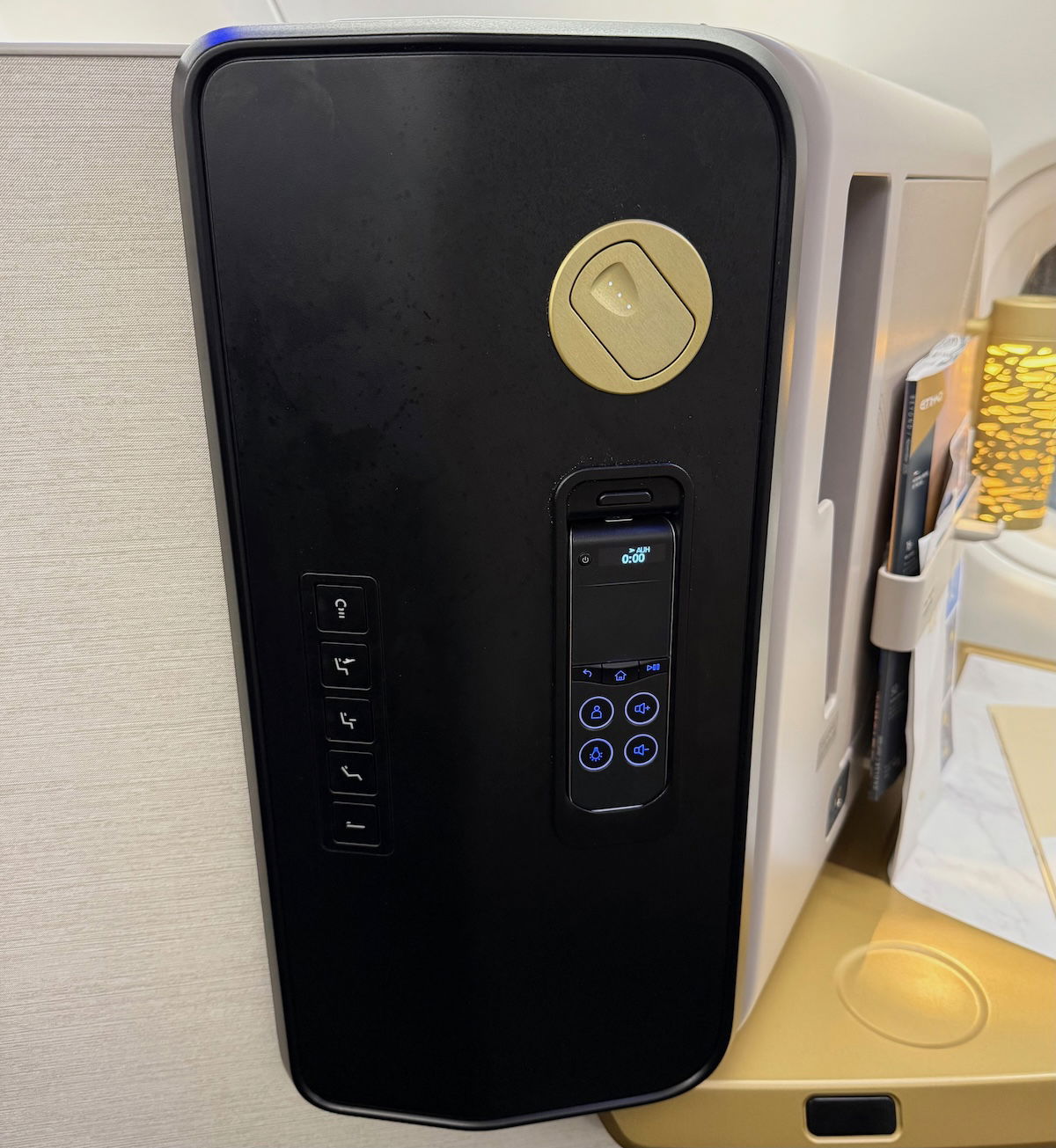 Next to the seat is an elevated panel with the seat controls, the entertainment controller, and the reading light. Kudos to Etihad for not placing the seat controls on the armrest, as so many airlines do, as it’s easy to push those by mistake.