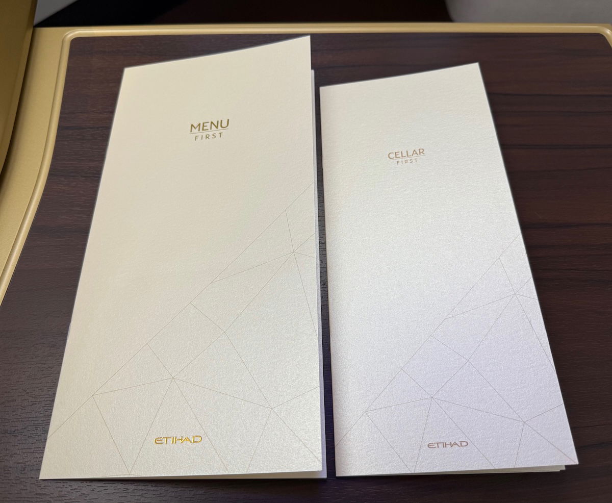 Etihad offers a dine on demand service in first class, and I imagine that’s especially the case when you’re the only passenger. The intent on this flight is that there’s one full meal service, and then a snack service before landing if you want it. Of course you can do it differently, but that’s the recommendation, at least. You can find the Etihad first class menu below.