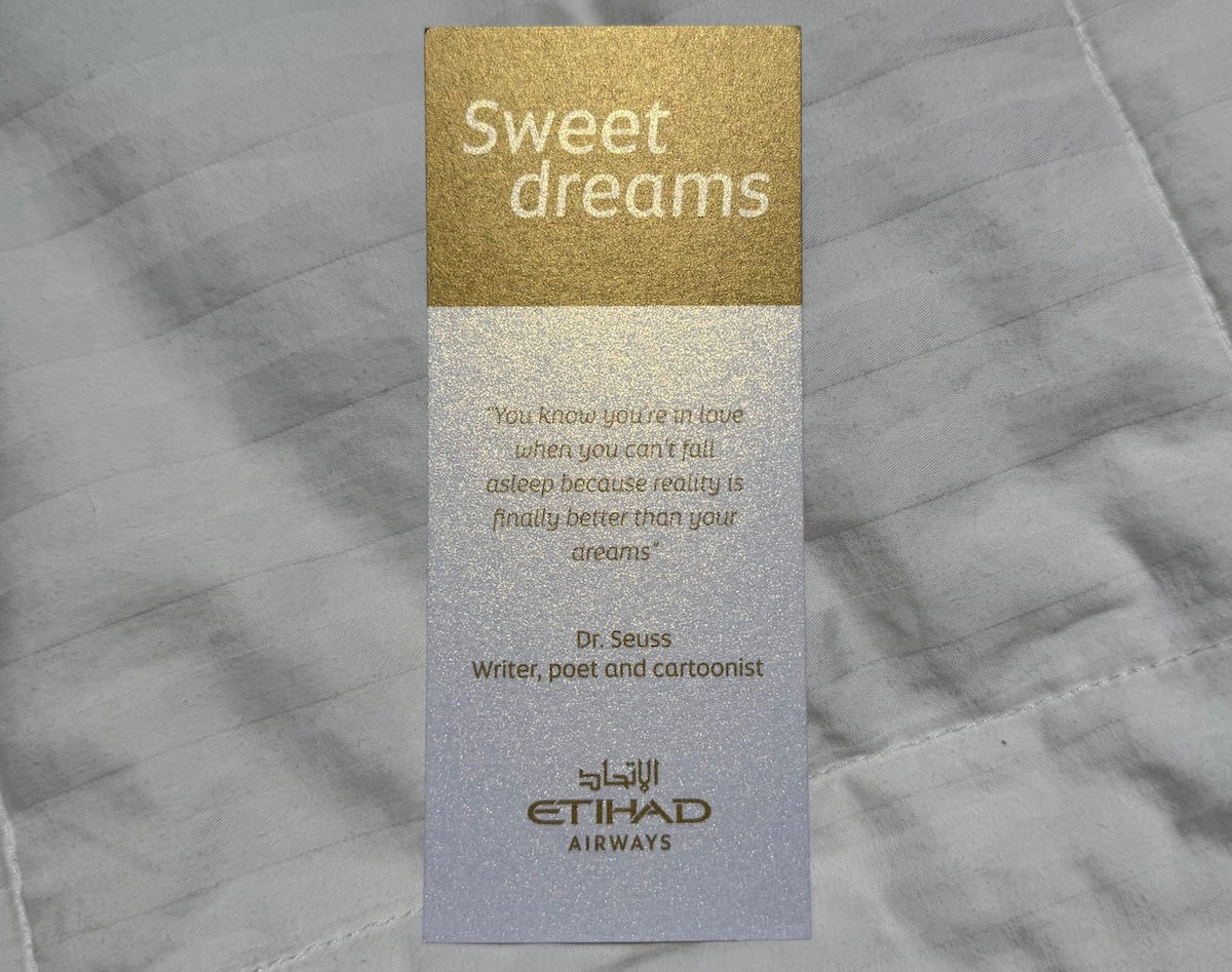 I love the bookmark that Etihad places on first class seats with turndown service, with a Dr. Seuss quote. “Sweet dreams. You know you’re in love when you can’t fall asleep because reality is finally better than your dreams.”