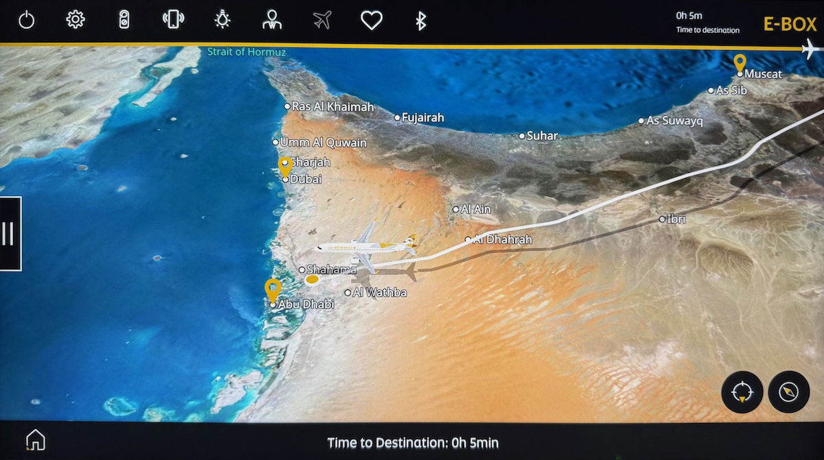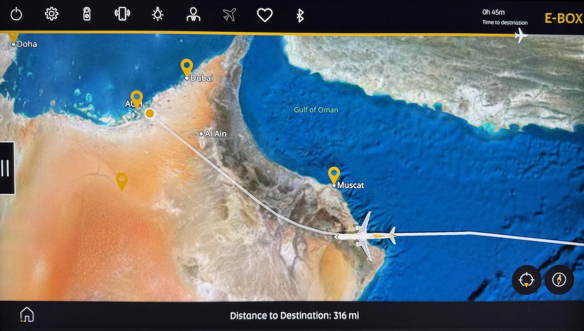 …and I woke up with around 1hr40min remaining to Abu Dhabi, while over the Arabian Sea. A three hour nap really hit the spot, given that it would still be a very long night, followed by another full day of flying.