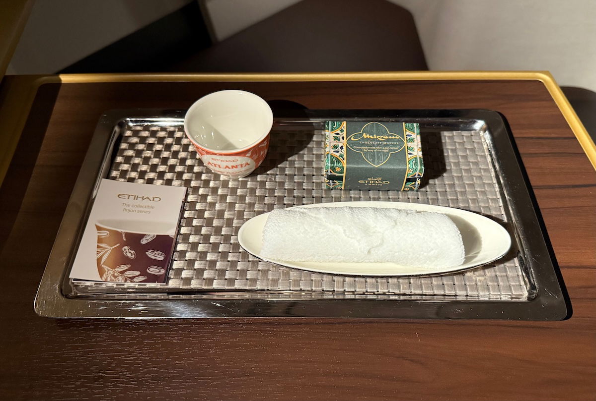 Another nice aspect of the pre-landing service is that I was given a tray with a warm towel, a box of chocolates from Emirati chocolatier Mirzam, and the choice of a finjan (the small cups in which Arabic coffee are typically served).