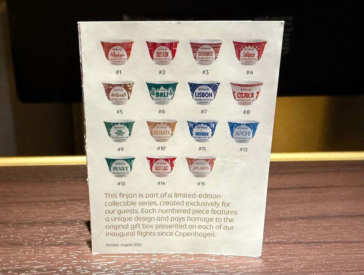 Etihad has been adding a lot of new destinations lately, so the airline offers passengers a cup with the name of a city that Etihad recently added, as a memory of the flight. That’s a cute way to create a collectible item!
