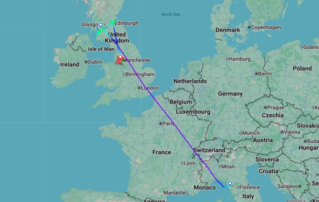 The flight departed from Pisa Airport at 17:28 local time, over an hour after its scheduled departure time. The flight took off and headed northeast, routing over Switzerland, France, and up the spine of the UK towards Prestwick Airport. According to The Guardian, as the flight approached Scotland, amber weather warnings were in place for all airports in the north of the UK as Storm Amy battered the country with high winds and heavy rain.