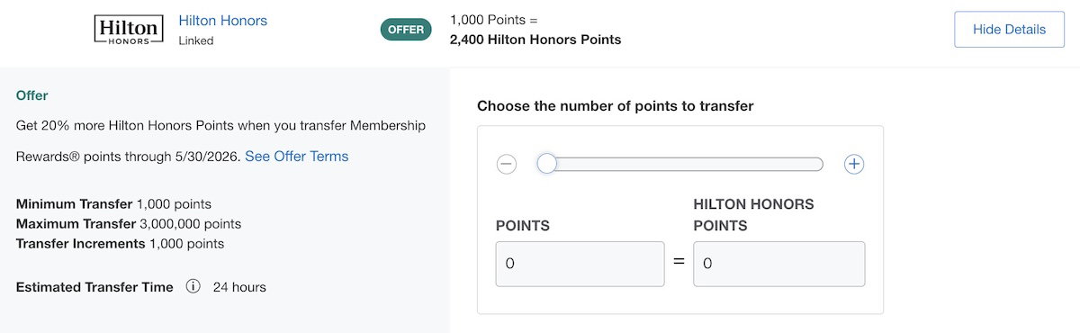 Points ordinarily transfer between the programs at a 1:2 ratio, meaning that during this promotion, points transfer at a 1:2.4 ratio. In other words, you get 2,400 Hilton Honors points for every 1,000 Amex Membership Rewards points transferred.