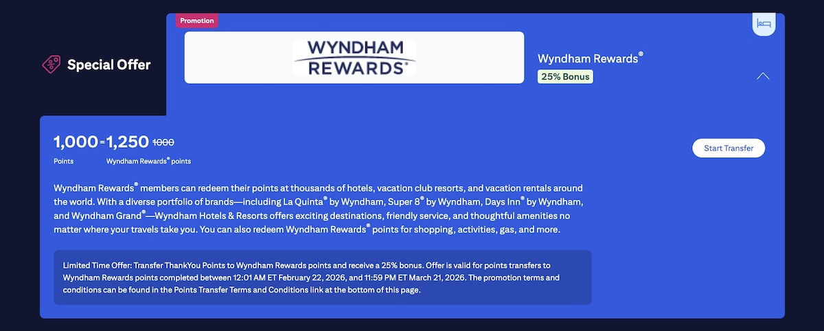 Between February 22 and March 21, 2026, the Citi ThankYou program in the United States is offering a 25% bonus on points transfers to Wyndham Rewards.