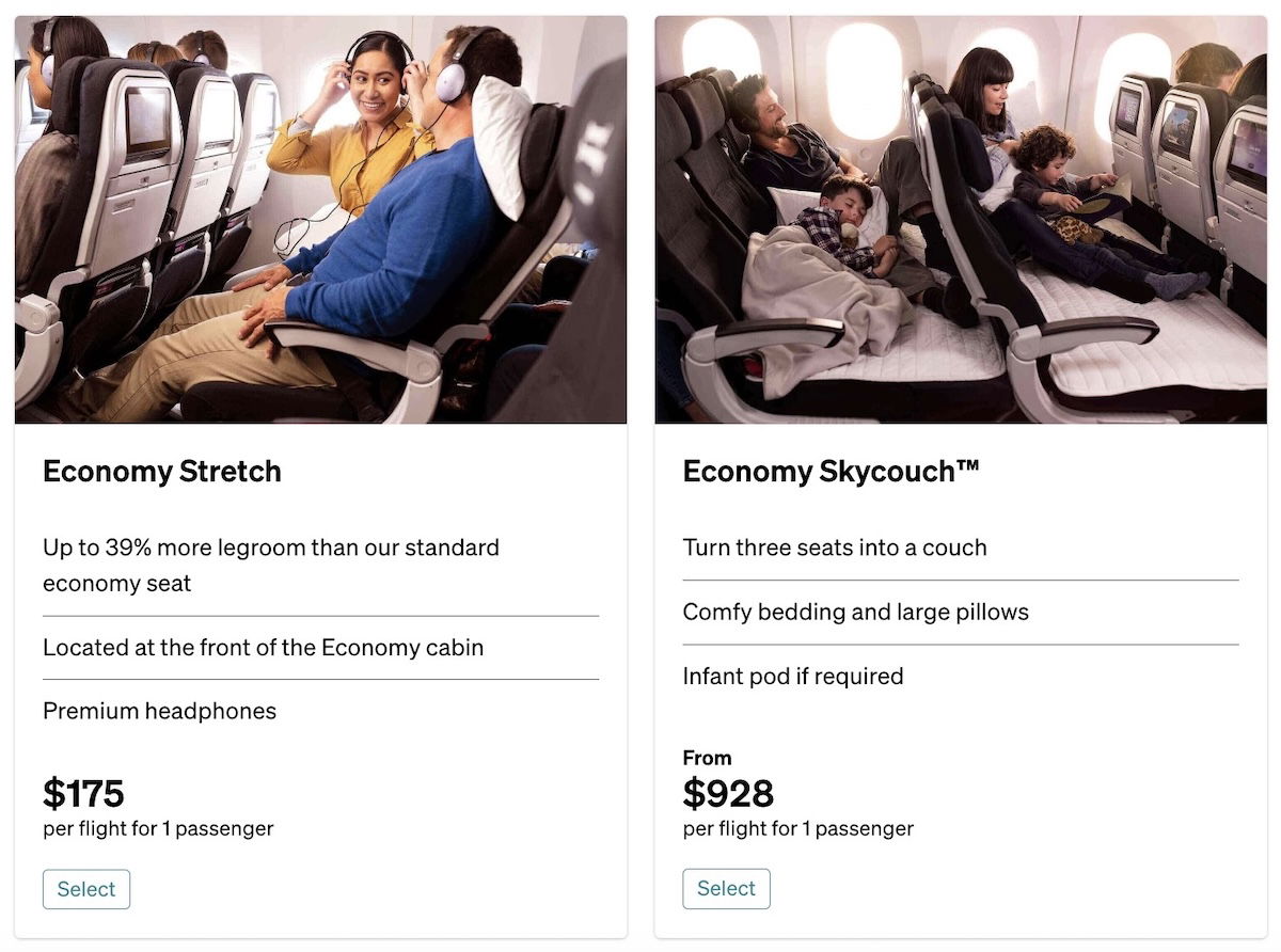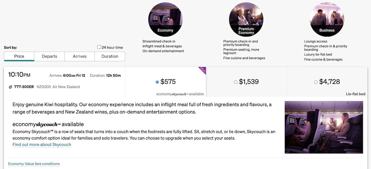For what it’s worth, Air New Zealand’s Skycouch product is priced based on whether there are one or two travelers. For example, if you’re a solo traveler from Los Angeles to Auckland, an economy ticket might be $575 one-way, including all taxes and fees.