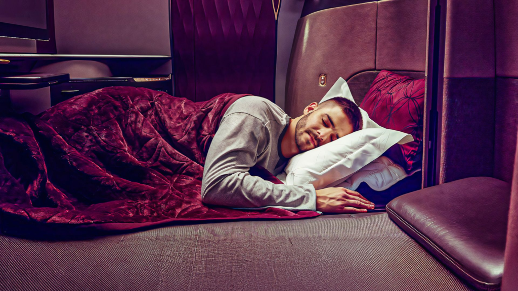 Qsuite is Qatar Airways’ business-class hard product that was built to deliver true privacy without sacrificing comfort. Every seat is a self-contained suite that features a sliding door, higher partitions, and do-not-disturb controls that create a calm, personal space. Each seat is incredibly wide and features a fully lie-flat seat. This includes plush bedding and a sturdy, oversized table that doubles as an actual desk. Thoughtful cubbies and shelves keep devices, water, and amenities within easy reach of passengers.